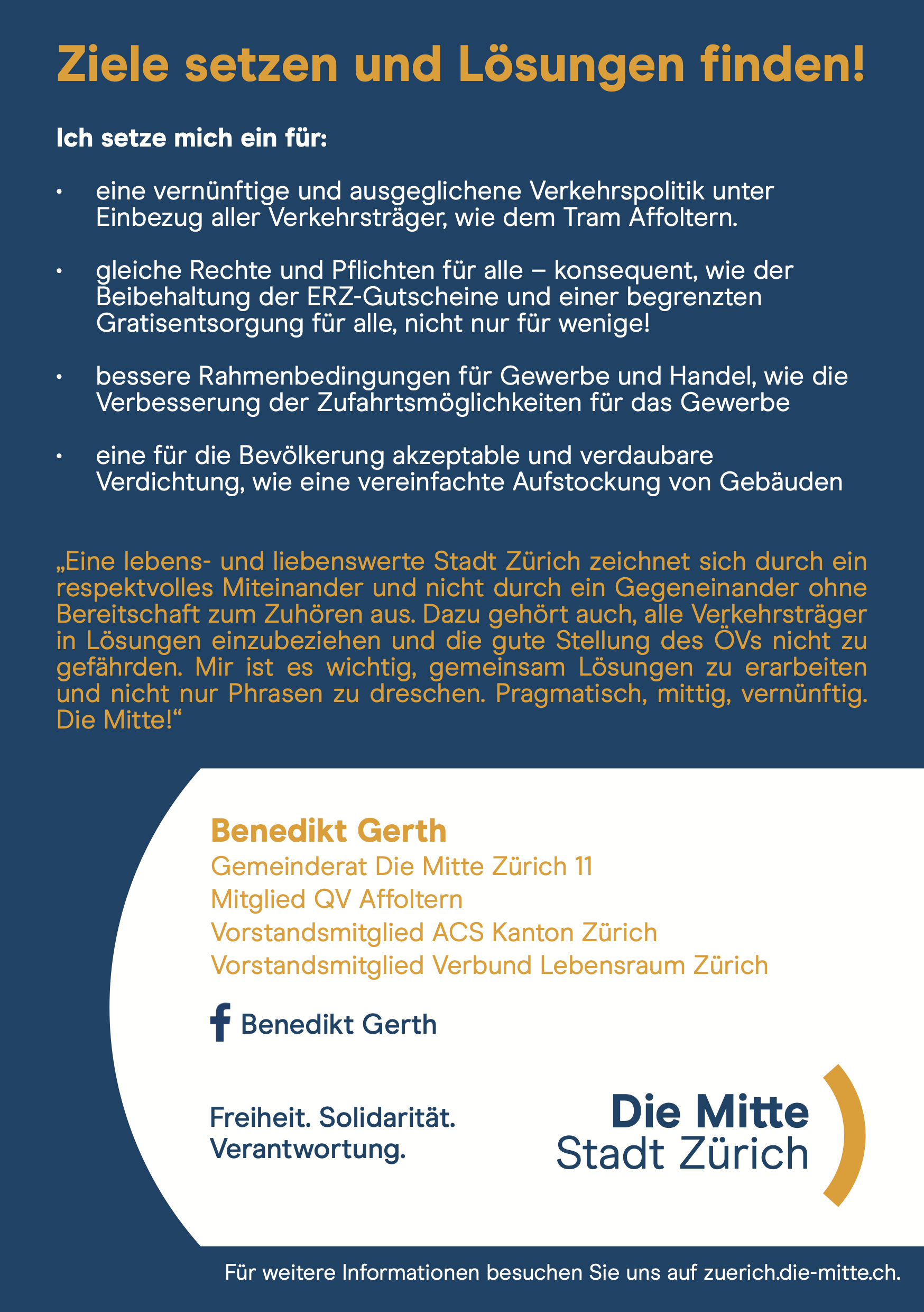 Am 8. März 2026 finden die Gemeinderatswahlen in der Stadt Zürich statt. Ich trete erneut an und darf als bisheriger Gemeinderat die Liste 7 der Mitte im Kreis 11 anführen. Seit Mai 2022 vertrete ich unseren vielfältigen und schnell wachsenden Stadtkreis im Stadtparlament. Seit Mai 2025 präsidiere ich zudem die Mitte-/EVP-Fraktion. Diese Verantwortung nehme ich engagiert und mit Freude wahr.
